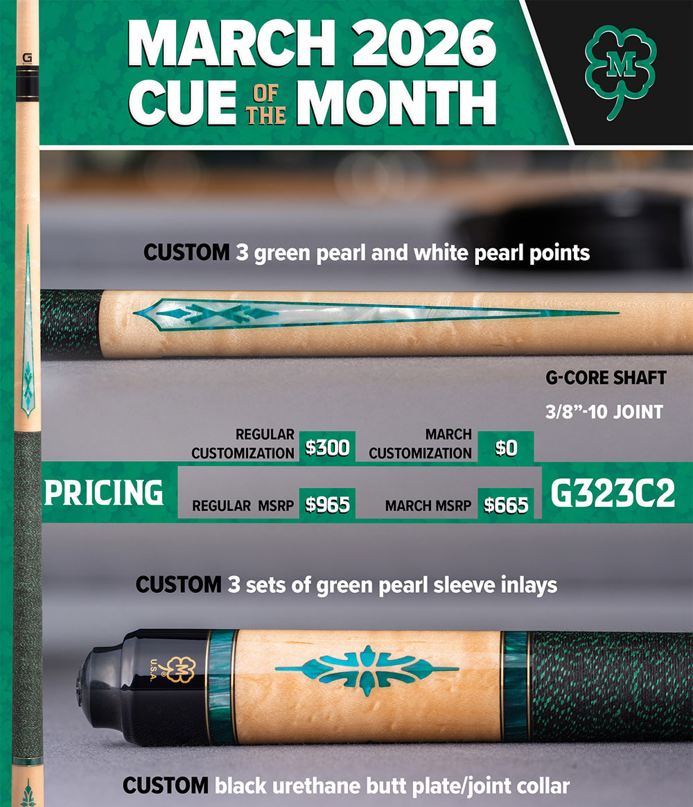G323C2 March 2026 Cue of the Month. Birdseye Maple forearm/sleeve,